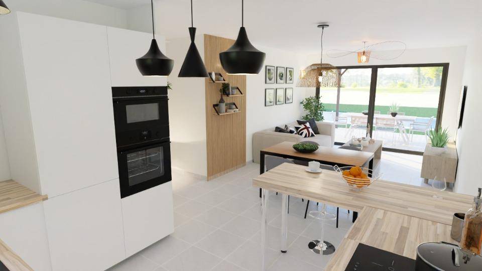 TERRAIN ET MAISONMaison de plain-pied de 90 m² – style traditionnelCharmante maison de plain-pied en L d’environ 90 m², au style traditionnel et fonctionnel, idéale pour une famille ou pour un projet de résidence secondaire.Elle se compose de :Une belle pièce de vie traversante, lumineuse et conviviale,Trois chambres confortables,Une salle d’eau moderne équipée d’une grande douche, d’une vasque et d’un WC suspendu indépendant,Un garage accolé pouvant être ajouté selon vos besoins.Maison pensée pour allier confort, praticité et charme de l’habitat de plain-pied.