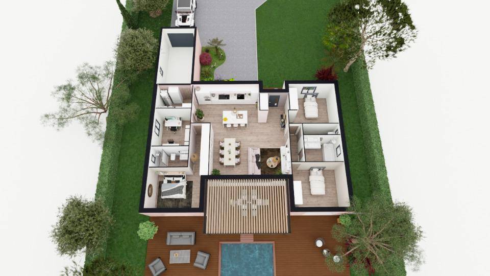 TERRAIN ET MAISONLa millenium 4 chambres est le plain-pied idéal pour toute la famille. La villa se compose d’un vaste et lumineux Salon/Séjour doté d’une grande baie vitrée attenant à un garage. Le coté nuit s’articule autour de 4 chambres avec placard, un WC indépendant et une grande salle de bains. Cette maison, d’architecture sobre et élégante, est à construire dans le département du Tarn, l’Aude, l’Hérault, la Haute-Garonne ainsi que les Pyrénées Orientales par Oc résidences, votre constructeur sur mesure en Occitanie.