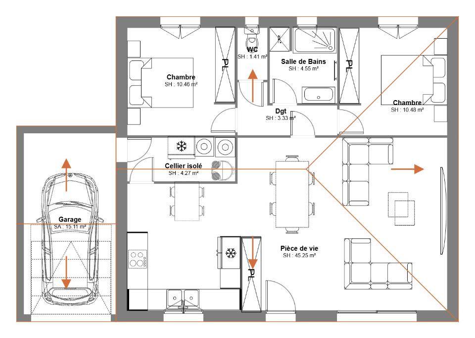 TERRAIN ET MAISOND’une architecture sobre et élégante, respectant les normes d’accessibilité cette maison est conçue de manière ingénieuse et fonctionnelle avec la particularité de pouvoir s’agrandir à moindre frais selon les besoins de la famille. Ces volumes sont optimisés pour que chaque membre de la famille puisse avoir son propre cocon. Les plus : Zone jour et zone nuit séparées – Salle d’eau avec douche et une vasque, Wc indépendant et un garage intégré. Le modèle ZEPHYR 71 est à construire dans le département du Tarn, l’Aude, l’Hérault, la Haute-Garonne ainsi que les Pyrénées Orientales par Oc résidences, votre constructeur sur mesure en Occitanie.
