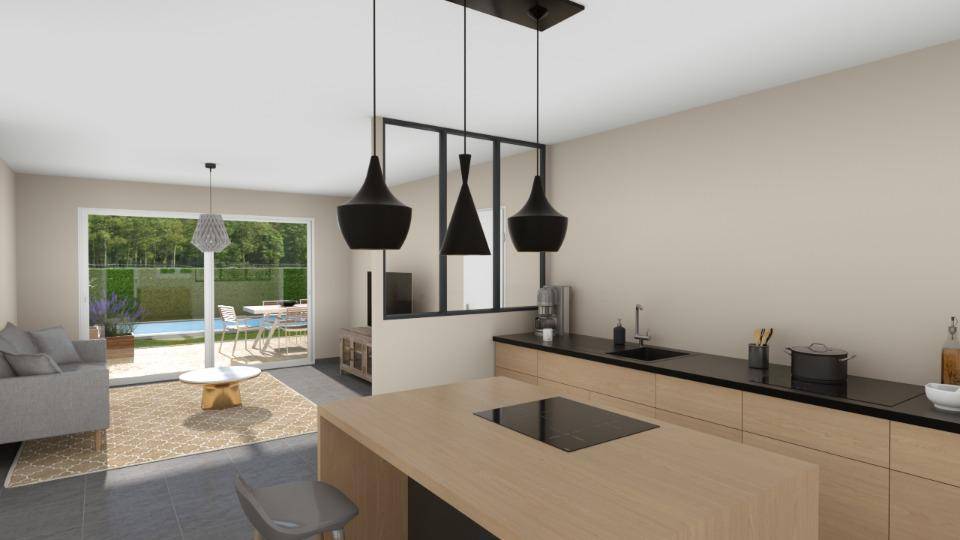 Exemple avec cette maison de plain pied de 100 m² habitables et ses 4 chambres, un espace de vie comprenant une cuisine ouverte. Projet entièrement personnalisable selon vos envies. Garage intégré d'une surface de 16 m².