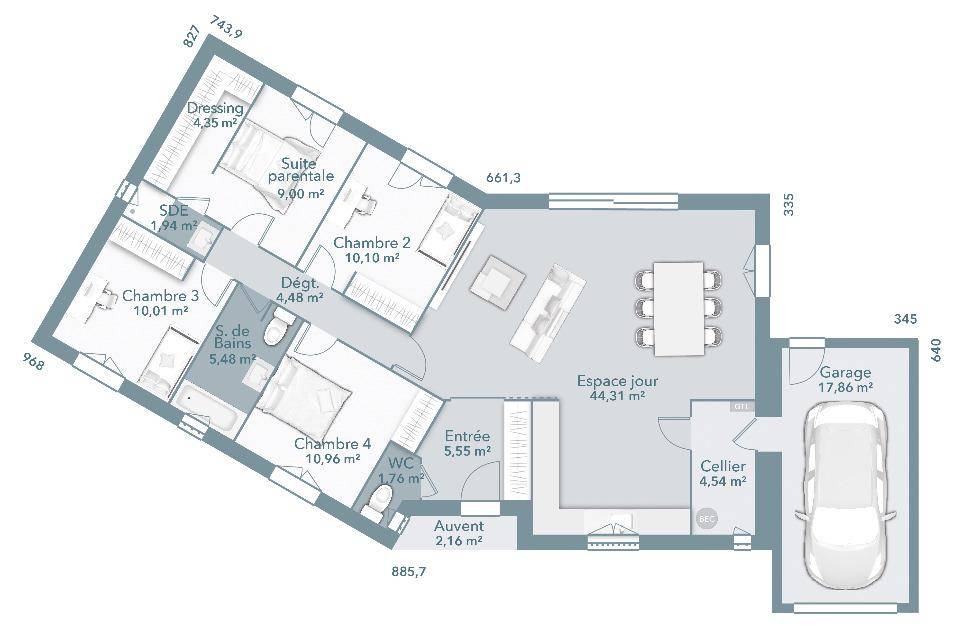 Cette maison de 5 pièces de plain-pied de 112 m². Conçue de plain-pied en V, elle dispose de trois chambres et une suite parentale, d'une cuisine et de deux salles de bains et un garage en option. La maison est aux normes RE 2020.