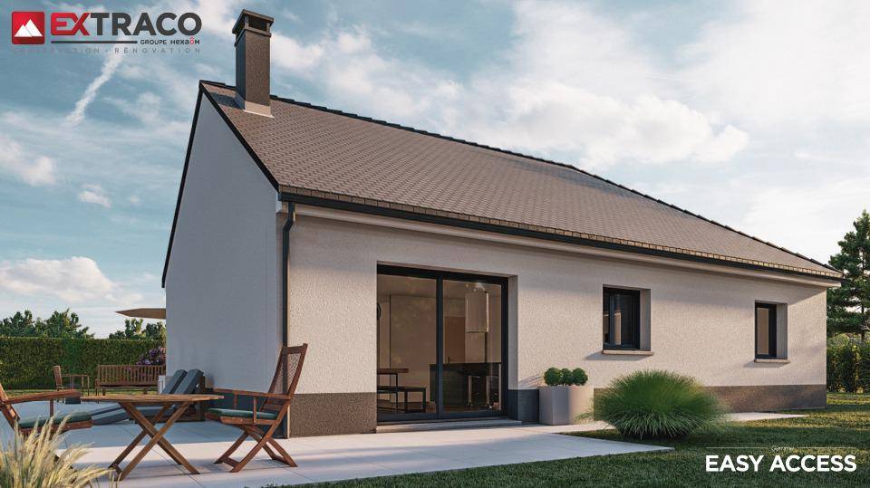 Conçue de plain-pied, elle comporte trois chambres, une cuisine et une salle de bains. Cette maison est neuve.