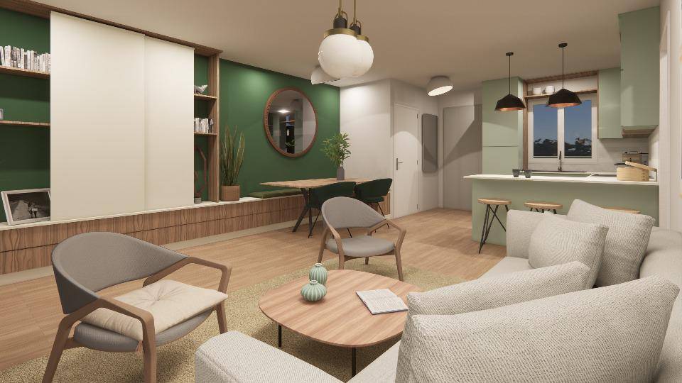 Son intérieur dispose de deux chambres, d'une cuisine ouverte sur une pièce de vie lumineuse et d'une salle de bains.