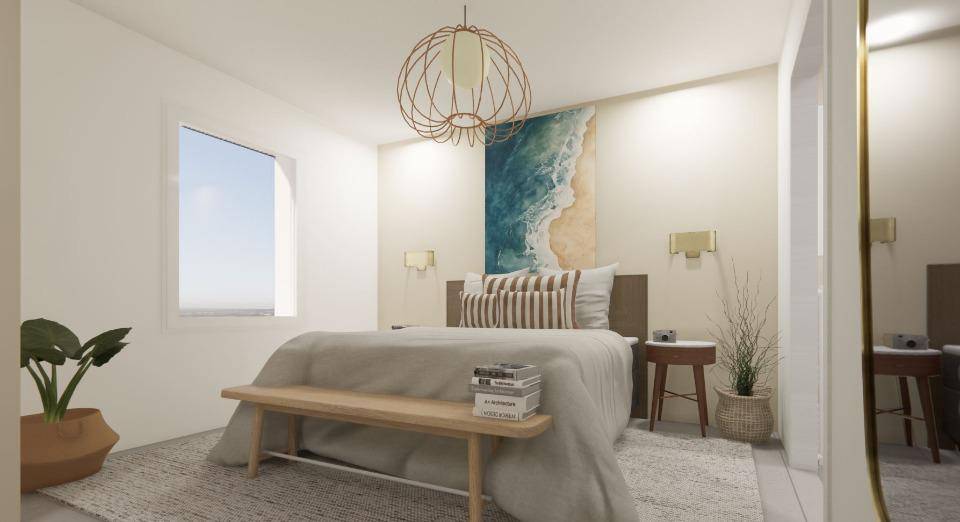 Elle compte deux chambres, une cuisine ouverte sur une pièce de vie lumineuse et une salle de bains.