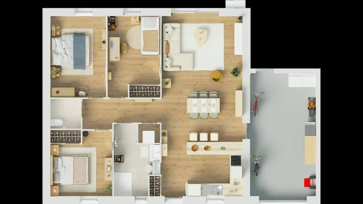 Sur ce terrain, nous vous proposons cette superbe maison de plain-pied au plan optimisé, pensée pour offrir confort et convivialité à toute la famille. Passé l’entrée, vous serez immédiatement séduit par une vaste pièce de vie baignée de lumière, où se côtoient salon, salle à manger et cuisine ouverte, idéale pour partager des moments chaleureux au quotidien.