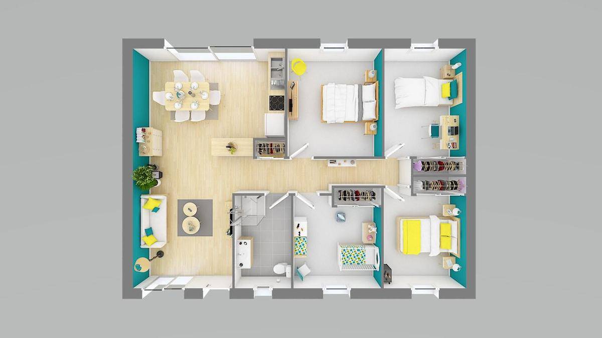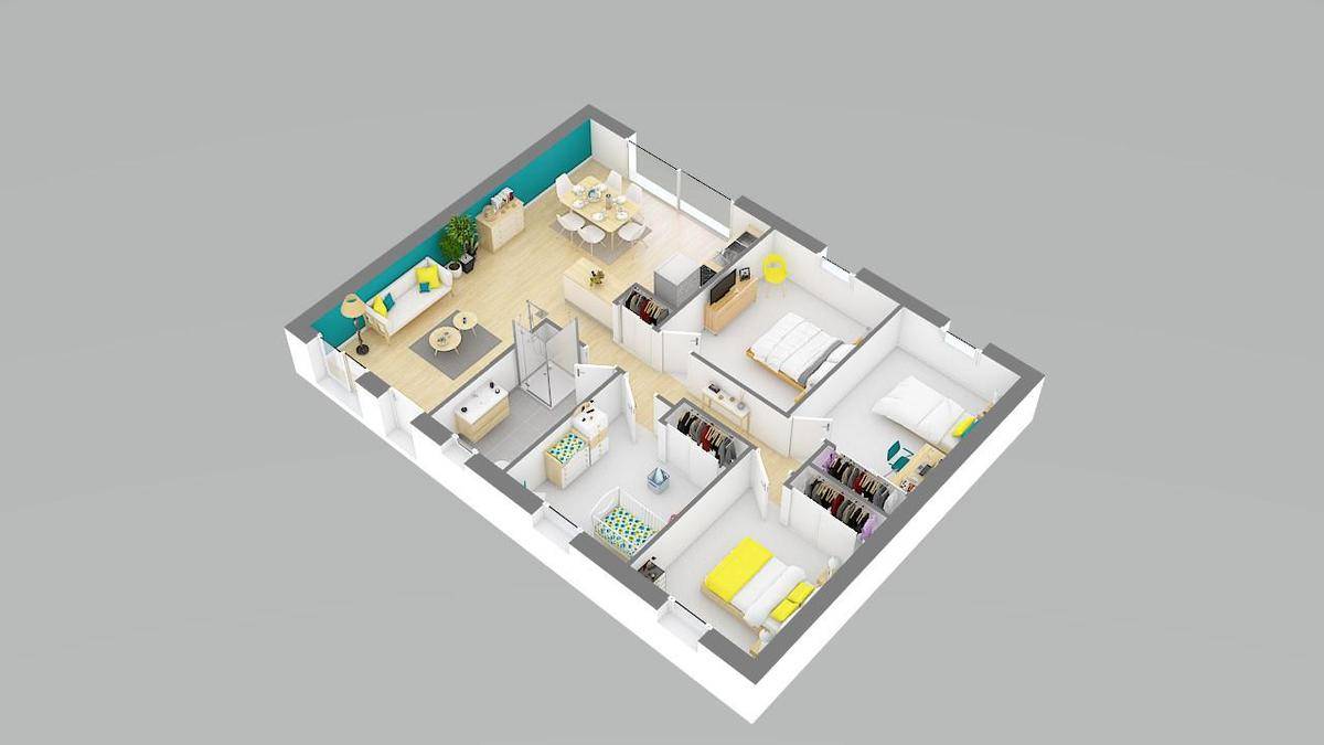 Avec une surface de 75 m², cette maison est parfaitement adaptée aux terrains étroits. Elle dispose de 3 chambres et de 4 pièces, offrant ainsi un espace de vie confortable et fonctionnel. Le séjour traversant permet une luminosité optimale et une circulation fluide entre les pièces.