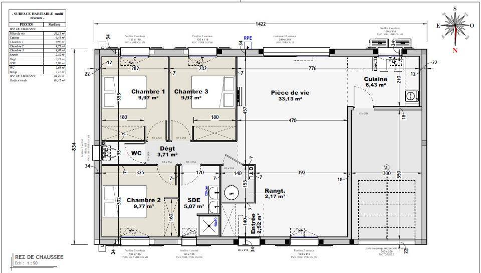 Composée de 3 chambres, séjour/cuisine, salle de bain et garage.