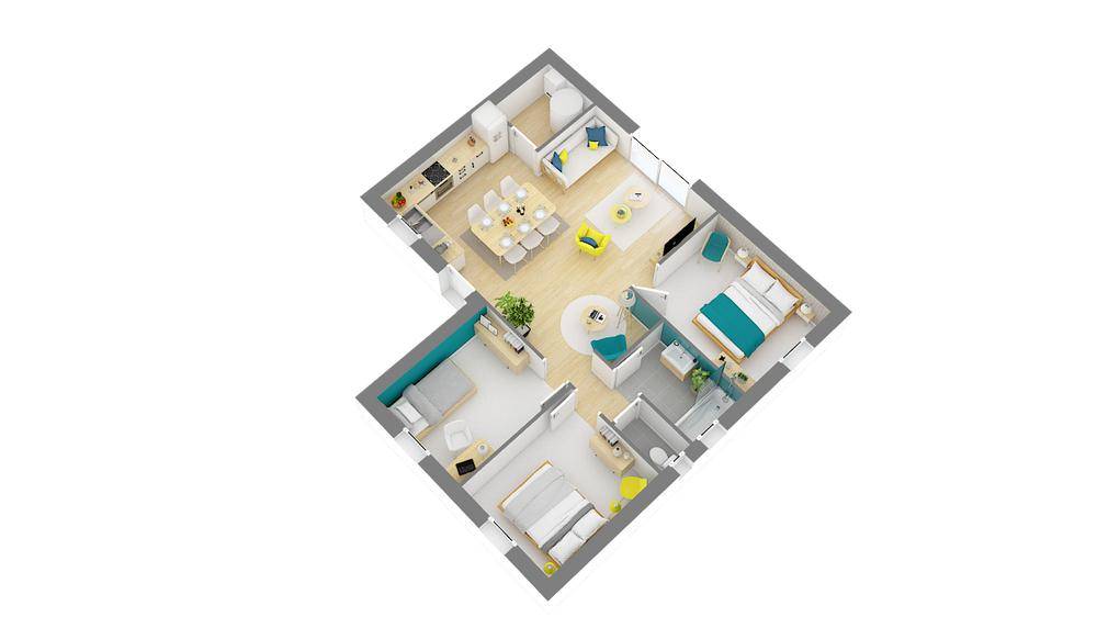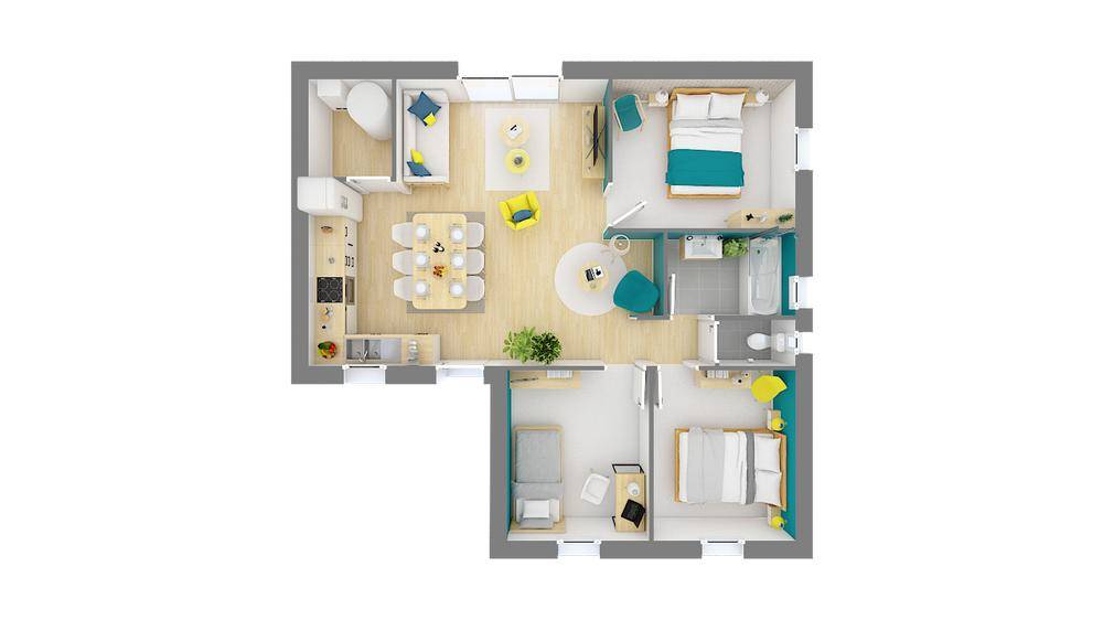Sur ce terrain, nous vous proposons cette maison neuve : la Selfy. Idéale pour les petits terrains, la Selfy est un modèle jeune et convivial, misant sur la personnalisation. Avec une surface de 75 m², cette maison dispose de 3 chambres et de 4 pièces, offrant un espace de vie confortable et fonctionnel.