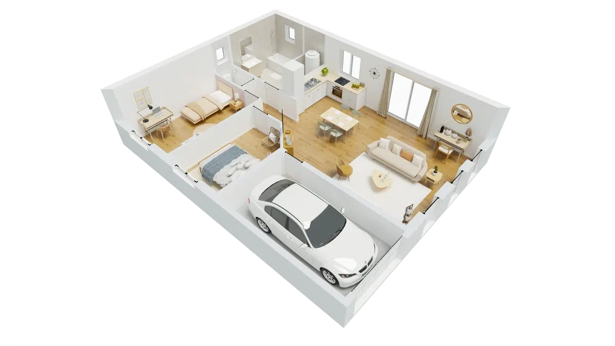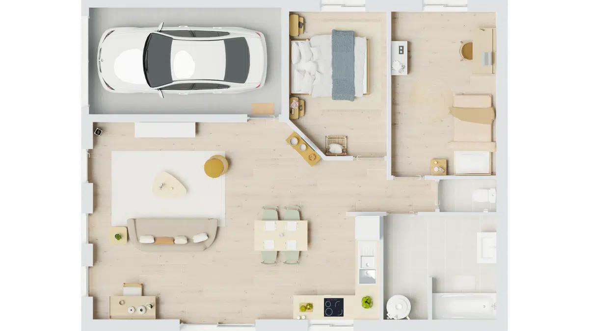 La maison Okapia se distingue par ses grandes pièces et son agencement optimisé. Elle comprend 4 pièces, dont 3 chambres spacieuses, offrant un cadre de vie confortable et convivial. La pièce de vie, qui occupe plus de la moitié de la surface habitable, est un véritable atout, permettant de profiter pleinement de moments en famille ou entre amis.