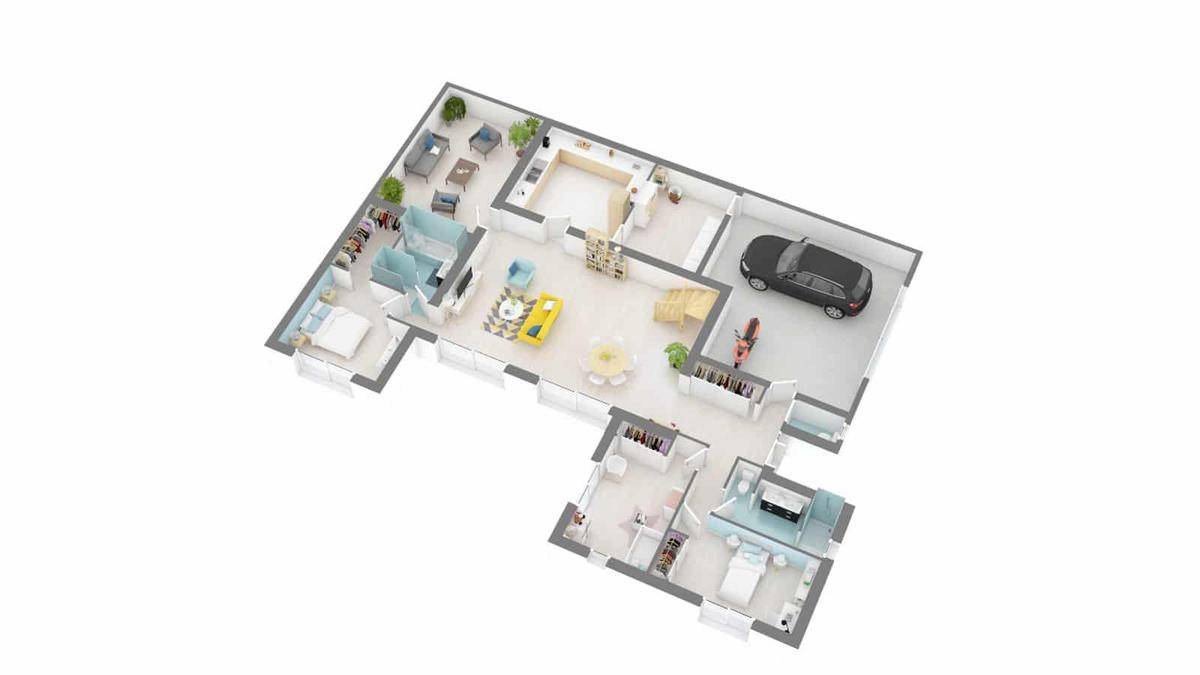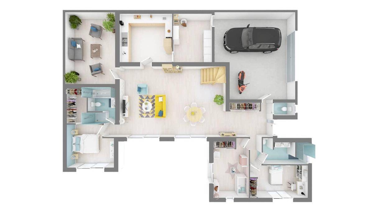 Le rez-de-chaussée de ce modèle Cordouan est composé d'une immense pièce de vie centrale autour de laquelle vous trouverez une cuisine semi-ouverte, un cellier, et deux belles chambres, chacune avec sa salle d'eau privative. Un double garage complète ce rez-de-chaussée, qui se caractérise également par de belles hauteurs sous plafonds grâce aux jeux de toiture. L'étage dispose d'un coin nuit avec deux chambres donnant sur une superbe loggia extérieure et une salle d'eau commune. À noter que ce plan peut être adapté, en optant pour des surfaces encore plus importantes.