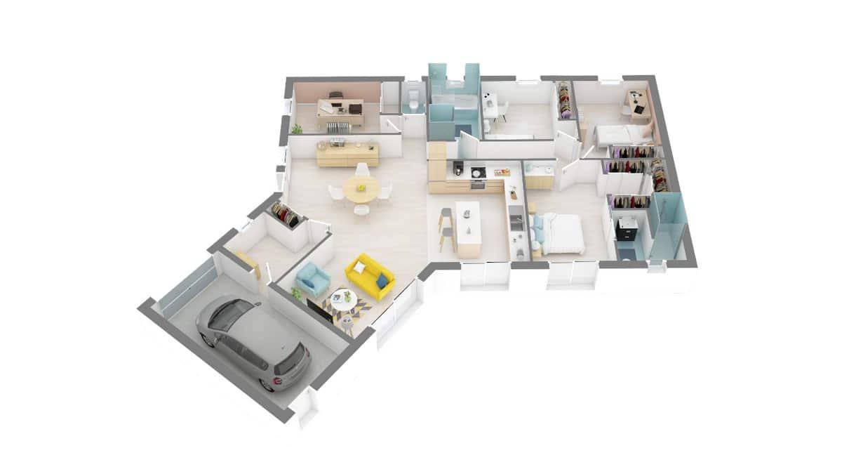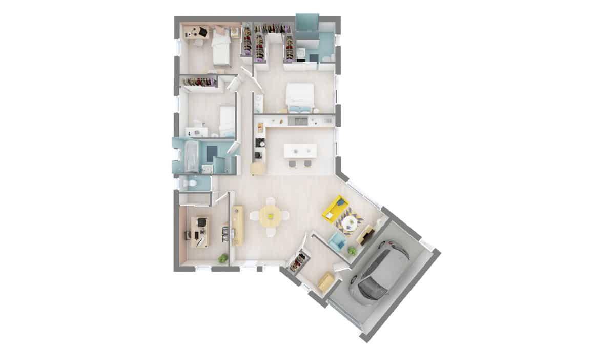 Notre modèle Aria est une superbe maison avec un plan en V, offrant une surface de 104 m². Elle se compose de 4 chambres et de 4 pièces, dont une grande pièce de vie avec cuisine ouverte et un espace nuit comprenant une suite parentale. Le plan en V permet une très bonne exposition, offrant à la maison des caractéristiques bioclimatiques, se traduisant par une luminosité optimale et des économies d'énergie grâce à la réduction des besoins de chauffage.