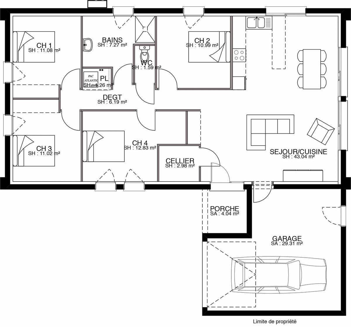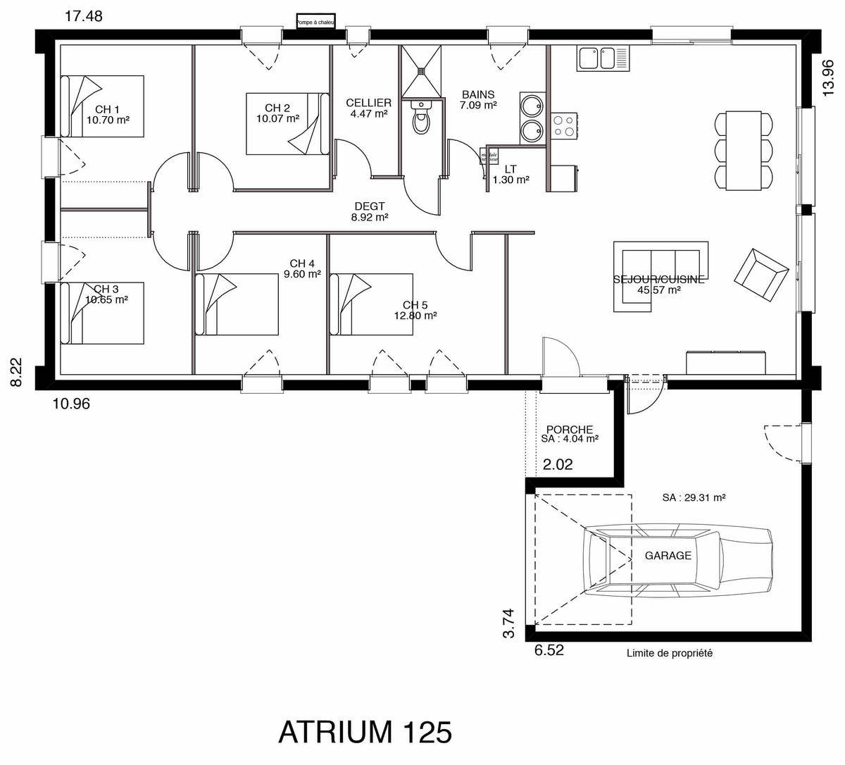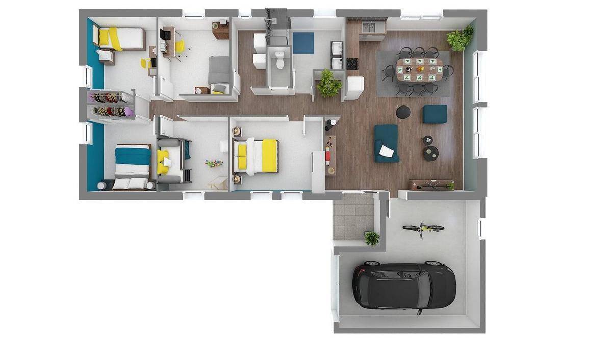 Sur ce terrain, nous vous proposons cette maison neuve, l'Atrium, conçue par le constructeur Elysees Ocean, reconnu pour ses excellents avis clients. Cette superbe demeure de 125 m², alliant tradition et modernité, se distingue par son architecture en L et son garage intégré.