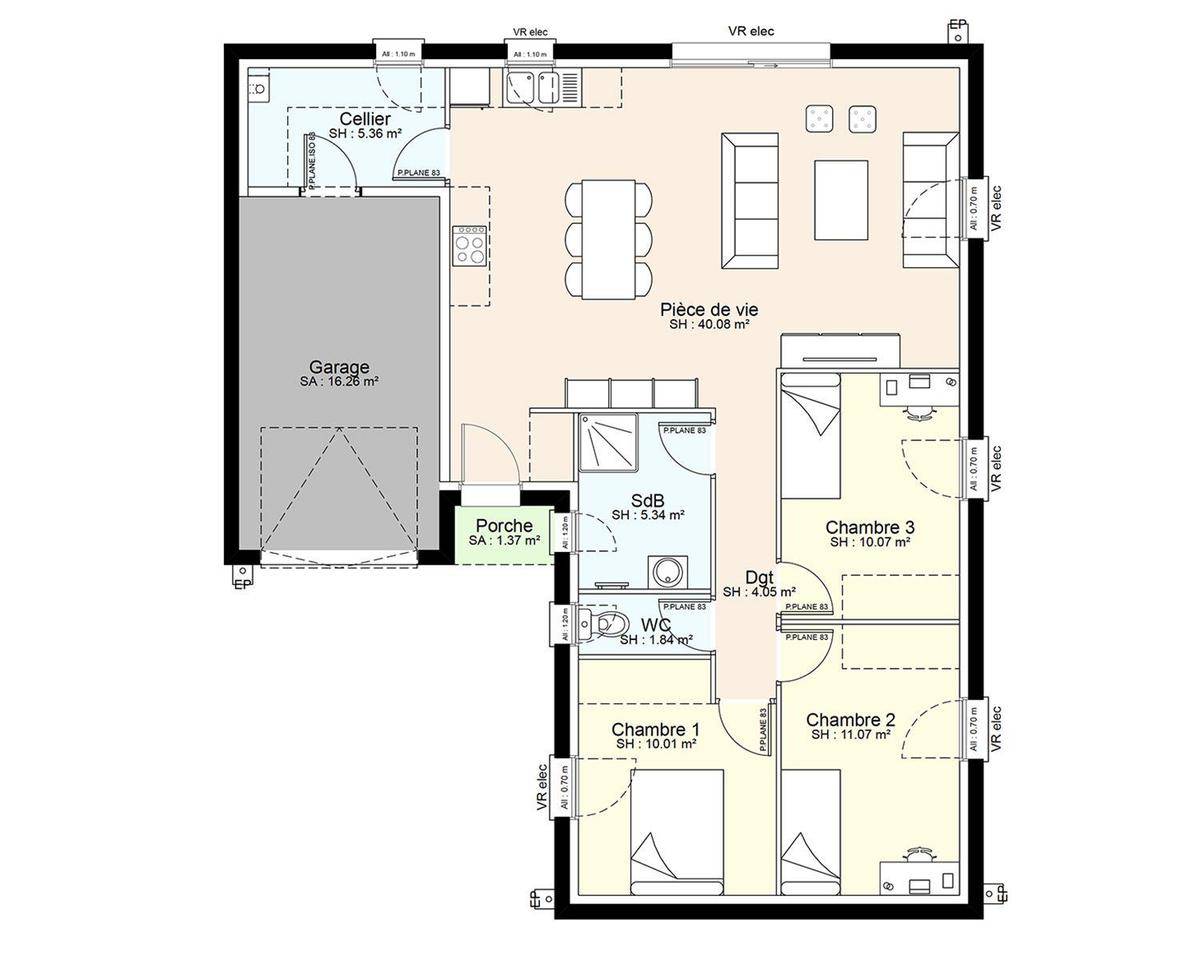 Spacieuse et lumineuse ! Cette maison en L à partir de 88 m2 habitable, vous offre une généreuse pièce de vie de 40 m2 avec cuisine ouverte sur salon et séjour, cellier isolé. Grande baie coulissante située sur l’arrière. Vous disposez de 3 chambres avec placard et d’une salle de bain équipée avec meuble vasque, douche et/ou baignoire, sèche serviette. Garage attenant de 16m2. Orientation cuisine salon séjour arrière. Carrelage grand format compris dans toute les pièces (hors chambres) et faïence au choix dans une large gamme disponible.