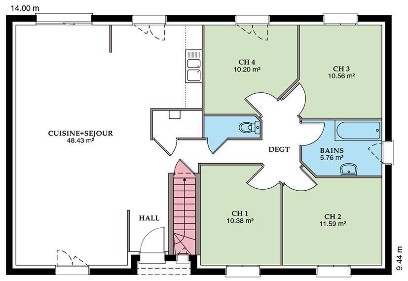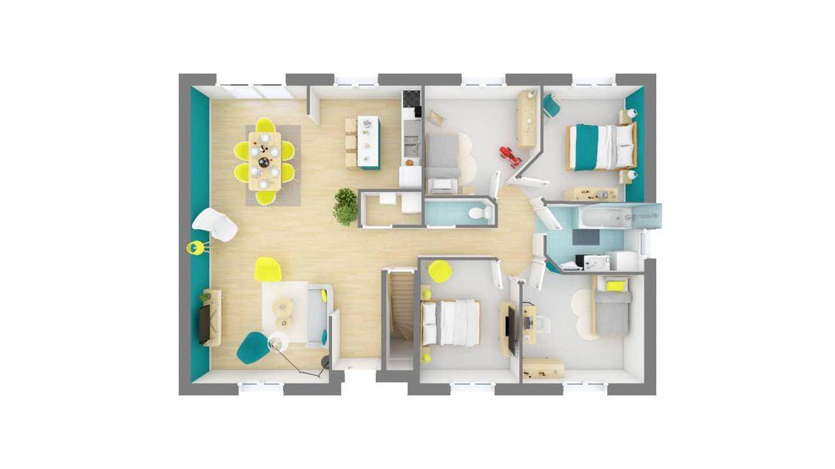 Proposée en toit 2 pans ou 4 pans, l’Aubetière s’adapte à tous les styles et s’intègre harmonieusement à son environnement. À l’intérieur, vous profitez d’un espace lumineux avec 4 chambres et un grand séjour ouvert, pensé pour la vie de famille.