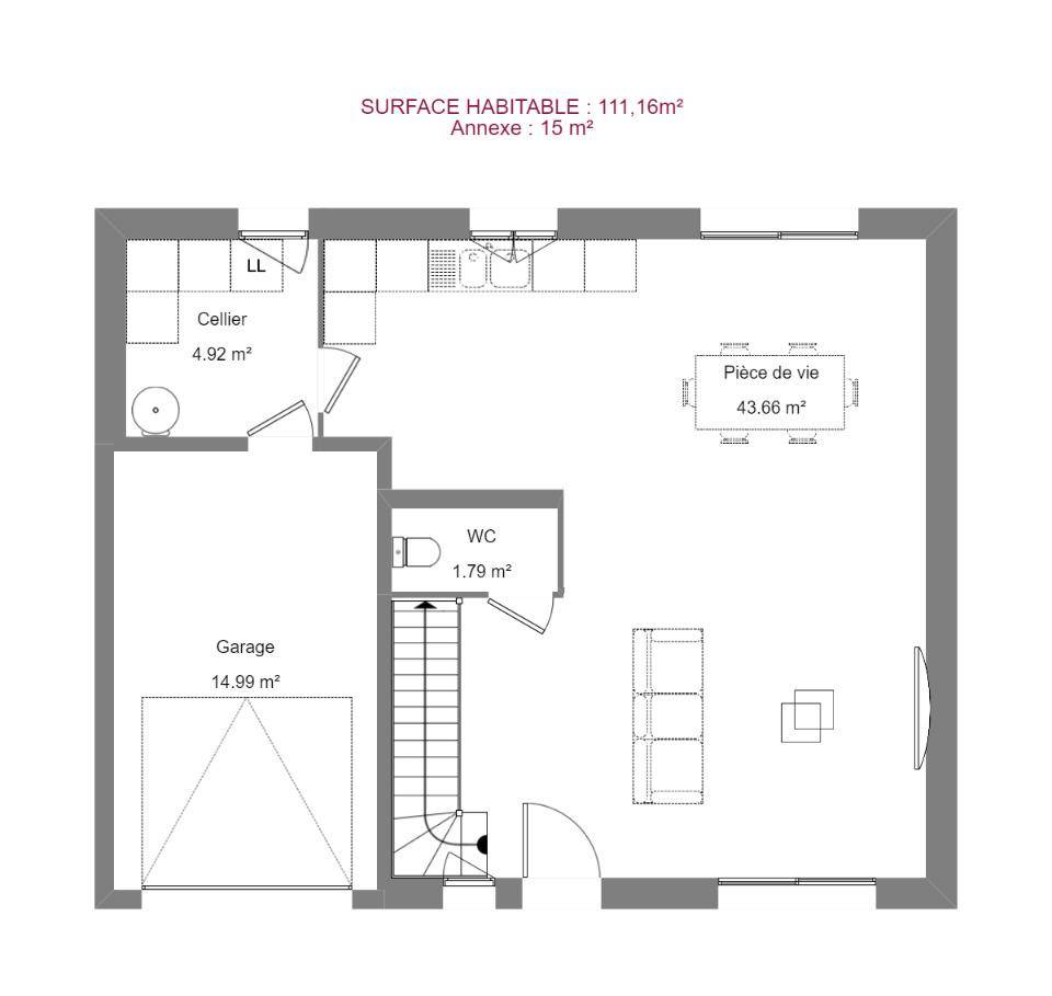 TERRAIN ET MAISONMaison de plain-pied conçue pour offrir un espace de vie confortable et fonctionnel, idéal pour une famille. L’agencement privilégie la convivialité avec un espace jour spacieux et lumineux, parfait pour les moments de partage. Les trois chambres, de tailles similaires, offrent à chacun son espace d’intimité, tandis que les espaces fonctionnels, tels que le cellier, le garage et la salle de bains, facilitent le quotidien.L’espace jour, véritable coeur de la maison, est baigné de lumière naturelle grâce à de larges ouvertures.Il offre un espace de vie ouvert et accueillant, idéal pour se détendre, recevoir des amis ou partager des repas en famille. Les chambres, quant à elles, sont conçues comme des havres de paix, offrant à chacun son espace personnel.Les espaces fonctionnels, tels que le cellier, le garage et la salle de bains, sont pensés pour faciliter le quotidien. Le dégagement central assure une circulation fluide entre les pièces.L’ensemble de la maison est conçu pour offrir un espace de vie agréable et pratique, où chaque membre de la famille se sentira chez soi.Réalisez la maison qui vous ressemble, adaptée à vos besoins avec MAISONS FRANCE CONFORT sur ce terrain en accord avec un partenaire foncier.📞 Contactez Maisons France Confort dès aujourd’hui pour plus d’informations et commencer votre projet de construction !