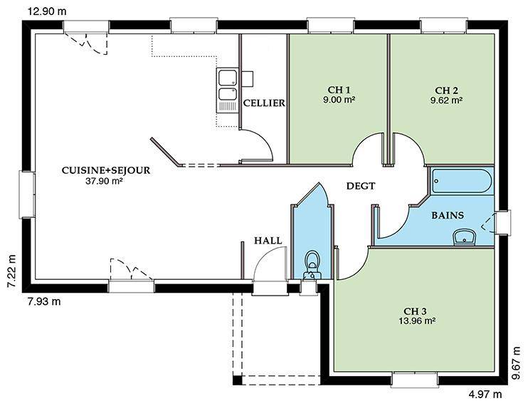 Ce modèle se distingue également par son engagement envers l'environnement et votre portefeuille. En effet, la ""Mezière"" est une maison basse consommation, rigoureusement conçue pour respecter les normes de la RE2020. Cette réglementation environnementale de 2020 garantit une efficacité énergétique supérieure, réduisant considérablement vos factures d'énergie tout en contribuant à la protection de notre planète.
