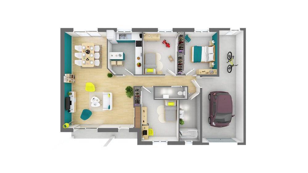Sur ce terrain, nous vous proposons cette maison neuve, le modèle Ménilière, une maison plain-pied moderne qui intègre de base un garage et une longue galerie sur la face avant. Avec une surface de 100 m², cette maison dispose de 4 chambres et de 4 pièces, offrant ainsi un espace de vie confortable et fonctionnel pour toute la famille.