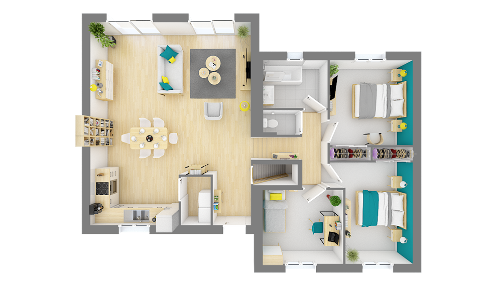 Cette maison de plain-pied dispose d'une surface de 86 m² et comprend 4 pièces, dont 3 chambres spacieuses. Vous avez la possibilité de choisir entre une toiture à 2 pans ou à 4 pans, selon vos préférences esthétiques et pratiques. De plus, vous pouvez opter pour un garage ou un sous-sol, en fonction de vos besoins spécifiques.