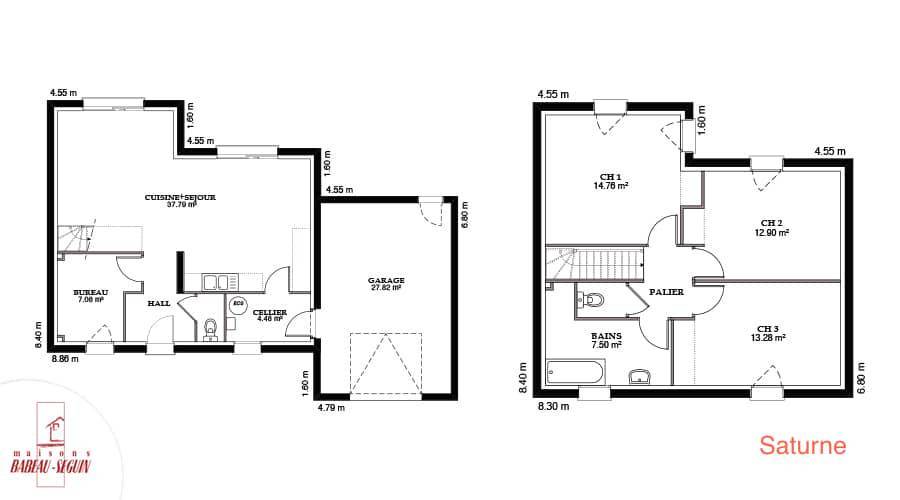 Sur ce terrain, nous vous proposons cette maison neuve : la Saturne de 117 m². Élégante maison contemporaine, la Saturne est disponible en trois versions de 97 m², 107 m² et 117 m², toutes avec garage accolé.