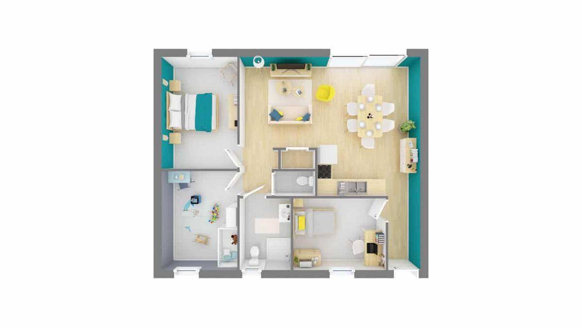 Sur ce terrain, nous vous proposons cette maison neuve : la Flavière Sud, un modèle compact et économique qui saura répondre à toutes vos attentes. Avec une surface de 65 m², cette maison de plain-pied se compose de 3 pièces, dont 2 chambres confortables, et inclut un garage intégré pour plus de praticité.