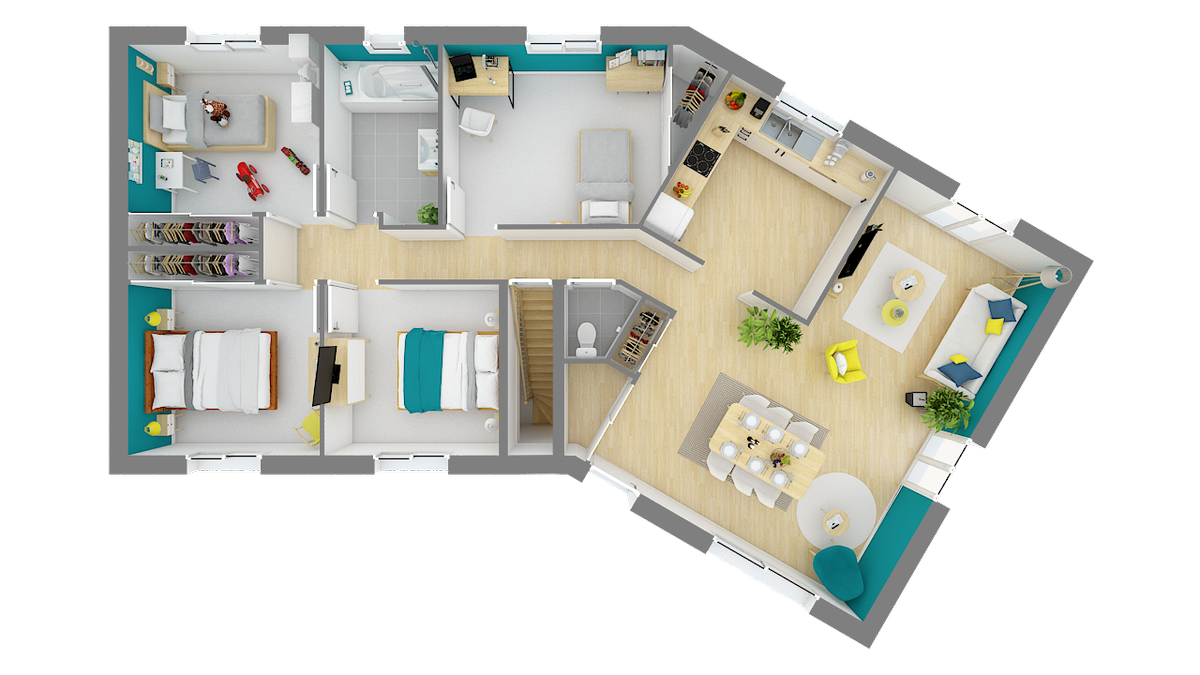 En forme de V, cette habitation de 85 m² très fonctionnelle se répartit avec d’un côté une aile nuit, comprenant une chambre spacieuse, une salle d’eau et des w.c., et une aile jour où se trouvent le séjour-cuisine et le cellier. Vous apprécierez le placard pratique qui sépare la cuisine de la pièce à vivre.