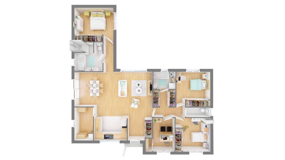 Sur ce terrain, nous vous proposons cette maison neuve : la Beauronne. Conçue par Maisons Omega, détenteur du label Maisons de Qualité, cette demeure de 104 m² est idéale pour les amoureux du beau et du fonctionnel.