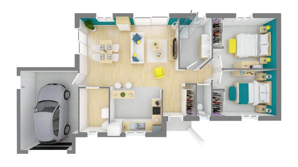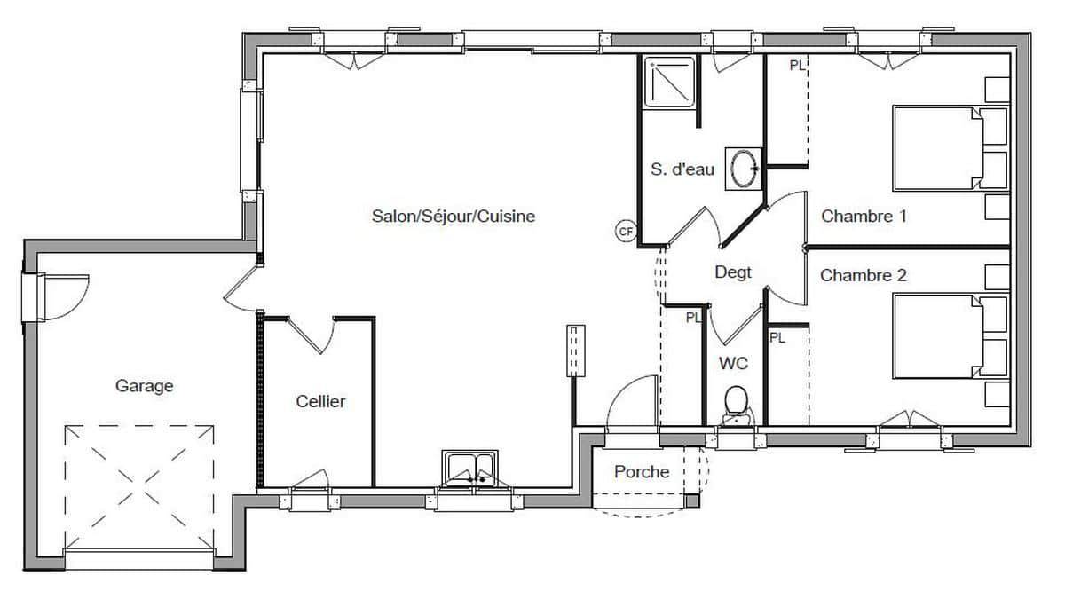 Avec une surface de 76 m², cette maison de plain-pied offre tout le confort nécessaire à votre bien-être. Vous y trouverez deux chambres spacieuses, une cuisine ouverte sur une vaste pièce de vie, une salle d'eau et des WC séparés. Un cellier pratique et un garage accolé viennent compléter les prestations de cette maison.