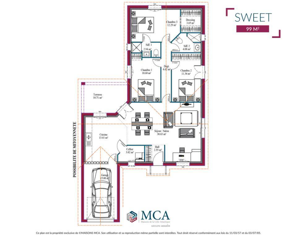 Les "Maisons MCA" vous proposent de découvrir cette maison de 4 pièces de plain-pied de 99 m² composée de trois chambres, dont une suite parentale, deux salles de bains et un salon séjour cuisine lumineux de 44m2. Elle comprend en outre une terrasse couverte d'un peu plus de 10m2 et un garage de 15m2.