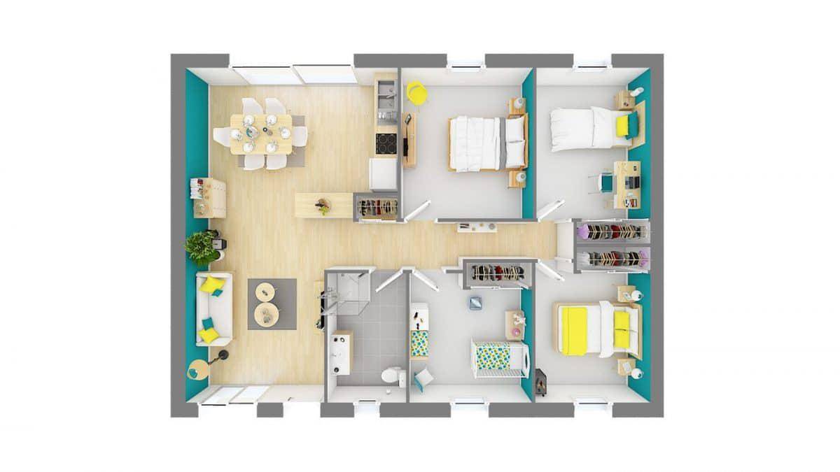 Sur ce terrain, nous vous proposons cette maison neuve : le modèle Challenger, spécialement conçu pour les primo-accédants ou les couples souhaitant bénéficier du meilleur rapport qualité/prix du marché. Avec une surface de 70 m², cette maison offre un espace de vie confortable et fonctionnel, idéal pour bien débuter dans la vie.