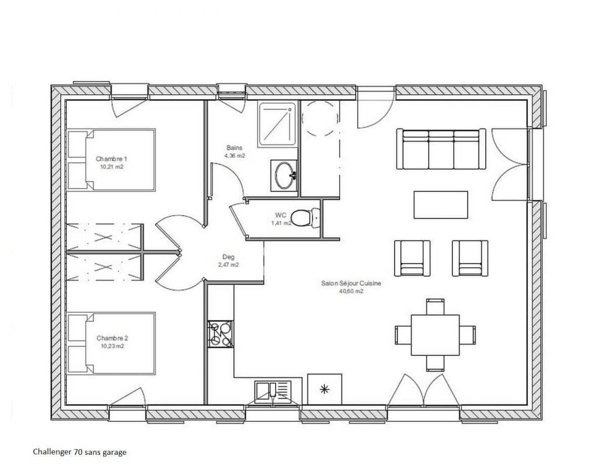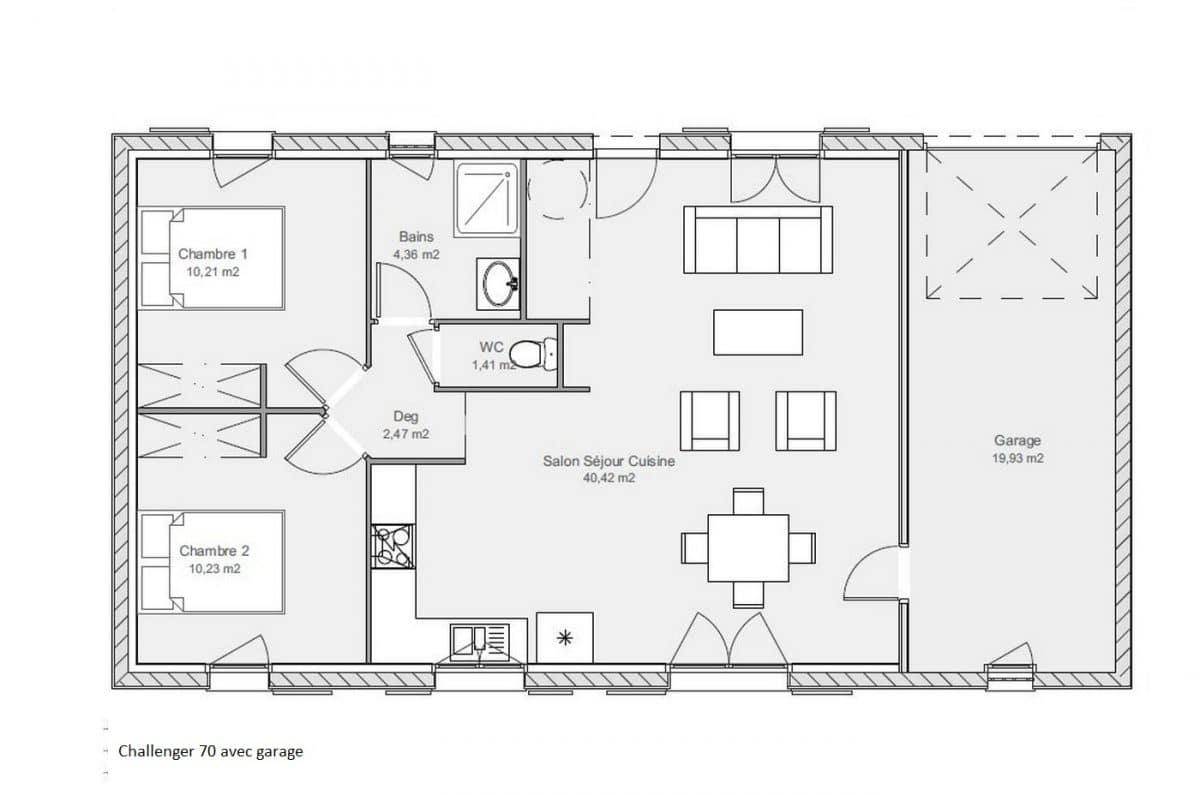 TERRAIN ET MAISONSur ce terrain, nous vous proposons cette maison neuve : le modèle Challenger, spécialement conçu pour les primo-accédants ou les couples souhaitant bénéficier du meilleur rapport qualité/prix du marché. Avec une surface de 70 m², cette maison offre un espace de vie confortable et fonctionnel, idéal pour bien débuter dans la vie.### Une maison neuve parfaite pour bien débuter dans la vieLa maison Challenger séduit immédiatement par ses formes simples et son intérieur confortable. Elle dispose de 3 chambres et de 4 pièces, dont un vaste séjour avec une cuisine ouverte. Les grandes portes-fenêtres assurent une excellente luminosité, créant un espace de vie agréable et chaleureux.### Construire une petite demeure neuve coquette et sympathiqueLa gamme Challenger se décline en plusieurs modèles, et celui-ci, avec ses 70 m², ne fait pas exception en termes de confort. Vous pourrez profiter de 3 chambres spacieuses et d’un séjour lumineux. Chaque modèle peut être personnalisé avec un garage intégré ou un carport selon vos envies et votre budget.### Caractéristiques principales- Petit prix : Une maison accessible pour les primo-accédants.- Basse consommation : Conforme à la norme RE2020, cette maison est conçue pour être économe en énergie.- Options populaires : Enduit coloré et volets roulants disponibles pour personnaliser votre maison.### Un extérieur moderne et séduisantL’aspect extérieur de la maison Challenger vous fera également tomber sous le charme, avec des façades résolument modernes soulignées d’enduit bi-ton et de menuiseries assorties. ### Constructeur de confianceMaisons Omega, détenteur du label Maisons de Qualité, est le constructeur de cette maison. Vous pouvez être assuré de la qualité et de la durabilité de votre future demeure.Vous êtes conquis ? Vous voulez en savoir plus sur cette maison à petit prix ? Contactez-nous afin d’en parler et d’obtenir tous les détails.