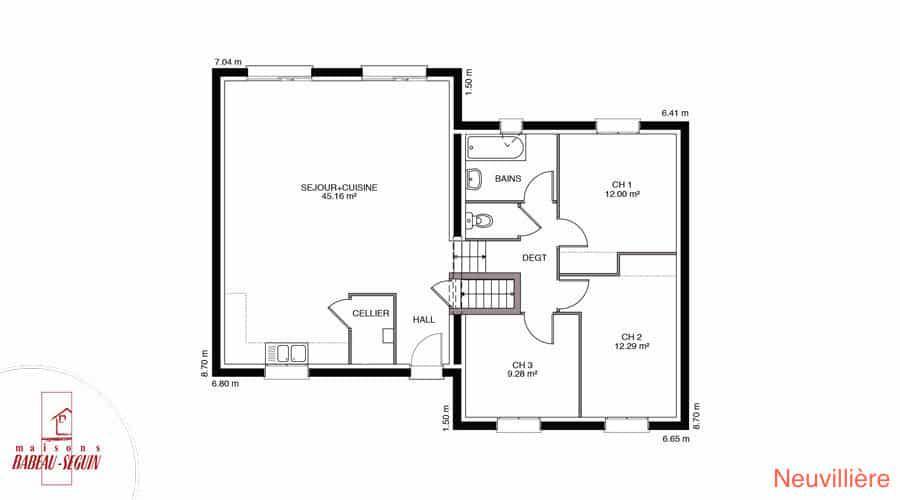 Sur ce terrain, nous vous proposons cette maison neuve, la Neuvillière, conçue par Babeau-Seguin, le constructeur offrant le meilleur rapport qualité/prix du marché. Librement inspirée de l’architecture Lorraine, la Neuvillière est une maison moderne à demi-niveau permettant de s'adapter à de nombreux terrains en pente ou escarpés.