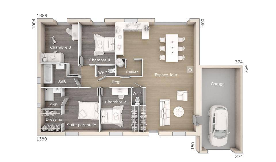 TERRAIN ET MAISONDécouvrez le modèle Étage GA 4 Ch Design, une maison moderne de 98 m² conçue pour répondre aux besoins actuels des familles : espaces optimisés, luminosité et confort au quotidien.Au rez-de-chaussée, profitez d’une grande pièce de vie traversante de 33 m², baignée de lumière, où la cuisine ouverte s’intègre harmonieusement au séjour.Une chambre de plain-pied apporte une véritable polyvalence d’usage : idéale pour recevoir ou aménager un espace de travail.Un cellier de 4,83 m², donnant accès direct au garage, vient compléter l’ensemble, offrant un espace de rangement pratique et fonctionnel.À l’étage, l’espace nuit se compose de trois chambres spacieuses et d’une salle de bains équipée d’une baignoire et d’une douche, pour un confort adapté à toute la famille.Grâce à la nouvelle gamme Open, vous bénéficiez de finitions personnalisables et de packs évolutifs, afin d’adapter votre maison à vos envies et à vos besoins.Côté confort, rien n’a été laissé au hasard : volets roulants électriques, centralisation des fermetures, domotique intégrée… autant d’équipements modernes pensés pour simplifier votre quotidien et renforcer votre confort.Fonctionnelle, lumineuse et résolument moderne, cette maison offre un cadre de vie idéal pour accueillir votre famille et concrétiser votre projet de vie.Contactez dès maintenant Olivier PUAUX, votre conseiller MAISONS FRANCE CONFORT, au (Numéro supprimé), pour en savoir plus ou imaginer ensemble votre future maison.