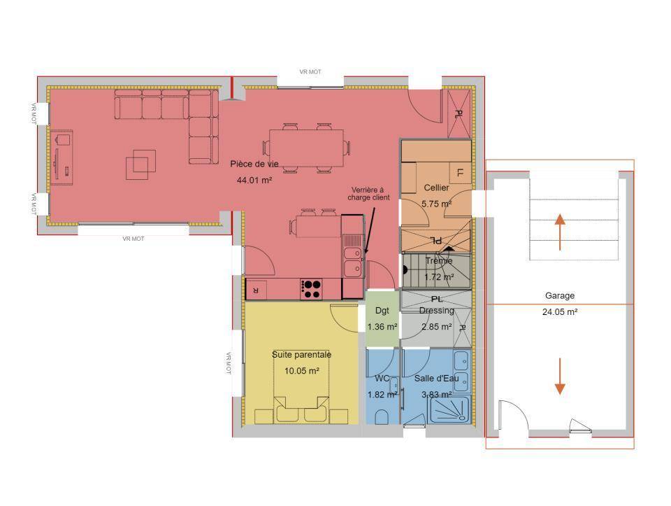 TERRAIN ET MAISONMaison contemporaine de plain-pied – 3 chambres dont 1 suite parentale – GarageDécouvrez cette maison contemporaine de plain-pied d’une superficie de 104,40 m², pensée pour offrir un cadre de vie à la fois moderne, lumineux et chaleureux.Dès l’entrée, une vaste pièce de vie de plus de 45 m² s’ouvre sur le jardin, baignée de lumière grâce à ses grandes ouvertures. Cet espace central, où se mêlent salon, salle à manger et cuisine ouverte, invite à la convivialité et aux moments partagés en famille.À proximité immédiate de la cuisine, un cellier fonctionnel facilite le rangement et l’organisation du quotidien, apportant un vrai confort d’usage. Le garage d’environ 20 m² vient compléter l’ensemble, idéal pour le stationnement ou pour créer un espace de stockage supplémentaire.Le coin nuit se compose de trois chambres confortables, dont une suite parentale spacieuse de 17 m² avec dressing et salle d’eau privative. Chacun y trouvera son intimité dans un cadre apaisant et bien pensé. Une seconde salle de bains et un WC indépendant viennent parfaire cet agencement harmonieux.La maison bénéficie également d’équipements modernes tels que les volets roulants électriques, la centralisation des volets et la domotique intégrée, autant d’atouts pensés pour simplifier votre quotidien et renforcer votre confort.Pour en savoir plus ou imaginer votre future maison, contactezOlivier PUAUX, votre conseiller MAISONS FRANCE CONFORT, au (Numéro supprimé).
