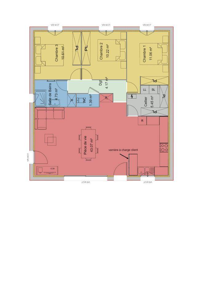 Située dans un quartier paisible, cette maison à construire offre un espace de vie moderne et confortable sur 90m2. Composée de trois chambres, elle est idéale pour une famille. La salle de bain est équipée d'une douche spacieuse, d'un meuble vasque et d'un placard pour plus de commodité. Un cellier pratique complète l'agencement fonctionnel de cette maison.