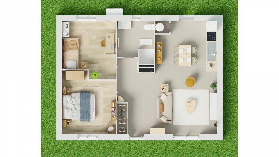 Son intérieur inclut deux chambres, une cuisine et une salle de bains. Cette maison est neuve.