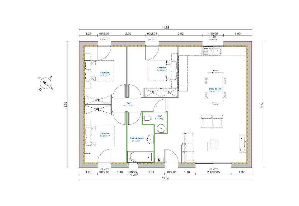 d'une entrée avec placard, une pièce de vie de 40m², un espace nuit avec 3 chambres et une salle de bain.
