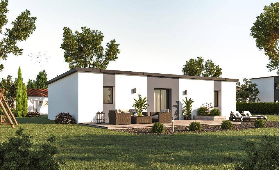 Conçue de plain-pied, elle est composée de trois chambres, d'une cuisine et d'une salle de bains. Cette maison est neuve.