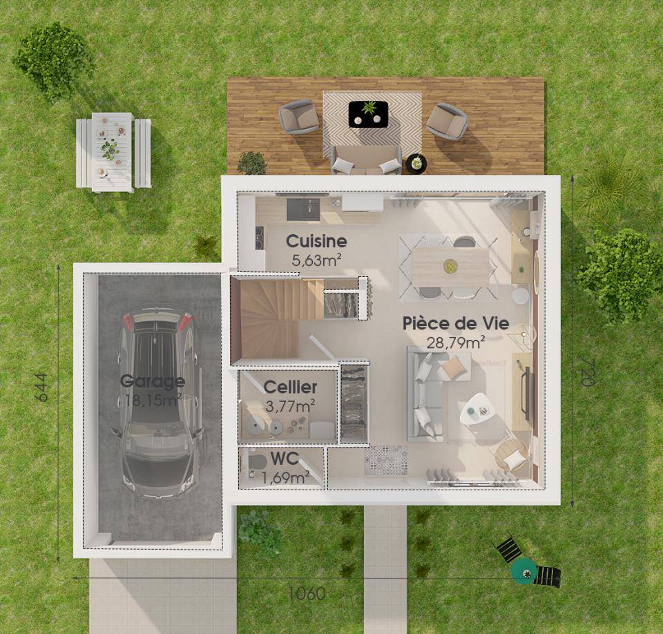 Le rez-de-chaussée de cette maison de 80 m² est dédié à un espace de vie traversant de près de 30 m² avec une cuisine de 6 m², complétée par un cellier avec accès direct au garage accolé de 18 m².