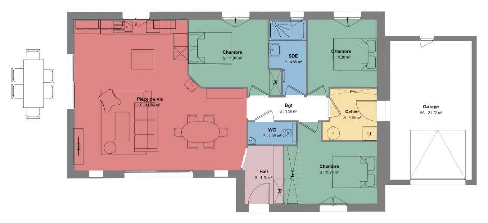 TERRAIN ET MAISONTerra 104 : L’alliance parfaite entre confort, espace et performance en ossature boisDécouvrez Terra 104, une maison de plain-pied de 104 m² au design chaleureux et contemporain, pensée pour offrir à votre famille un cadre de vie à la fois spacieux, lumineux et résolument fonctionnel. Grâce à sa construction en ossature bois, elle combine efficacité énergétique, bien-être intérieur et esthétisme naturel.Un vaste espace de vie lumineux de 45,54 m²Au coeur de Terra 104 se trouve un espace jour généreux de 45,54 m², baigné de lumière grâce à ses larges ouvertures. Cet espace convivial devient rapidement le centre des moments partagés : repas animés, soirées en famille, moments de détente… tout y trouve naturellement sa place.Ouvert, accueillant et parfaitement structuré, il crée une atmosphère chaleureuse où il fait bon vivre chaque jour.Quatre chambres pour le confort de toute la famillePensées comme de véritables cocons, les quatre chambres offrent à chaque membre de la famille son espace d’intimité. Qu’il s’agisse d’une chambre parentale, d’espaces pour les enfants ou d’une pièce polyvalente, chacun y profite d’un environnement calme et ressourçant.Des espaces fonctionnels qui simplifient le quotidienTerra 104 mise sur la praticité pour vous offrir une vie plus facile et mieux organisée :un cellier idéal pour le rangement et la gestion du quotidien,un garage intégré pour stationner en toute sécurité,une salle de bains fonctionnelle, adaptée à toute la famille,un dégagement central pour une circulation fluide dans toute la maison,des toilettes séparées pour un confort optimal.Chaque détail a été soigneusement pensé pour créer un intérieur à la fois accueillant, moderne et fonctionnel.