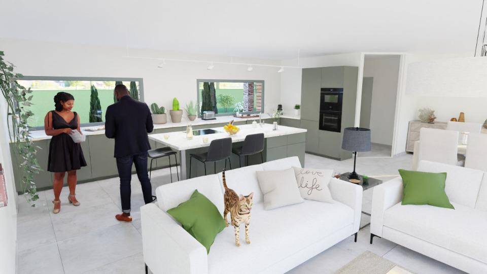 TERRAIN ET MAISON🏡 Villa de plain-pied de 107 m² – Style ultra contemporain & toiture plateLaissez-vous séduire par cette villa de plain-pied de 107 m² au design résolument moderne, avec toiture plate et lignes épurées, pensée pour un mode de vie confortable et lumineux.🛋️ Des espaces bien définis et ouverts sur l’extérieurLa maison s’organise autour d’un hall d’entrée baigné de lumière, qui fait le lien entre les deux zones principales :Espace jour :Une grande pièce de vie moderne avec cuisine ouverte,Salon et salle à manger,Un cellier fonctionnel attenant à la cuisine.Espace nuit :Une suite parentale avec dressing et salle d’eau,Deux chambres confortables,Une salle de bain indépendante,Un deuxième WC séparé.💡 Depuis l’entrée, vous bénéficiez d’une triple vue : sur le séjour, le jardin et la partie nuit.Un espace de travail y est également intégré, parfait pour le télétravail ou les devoirs des enfants.🔧 Prestations & finitions de qualitéArchitecture cubique avec toiture terrasseVolumes lumineux et bien agencésPlans personnalisables selon vos besoins📞 Contactez Caroline au (Numéro supprimé)Construisons ensemble votre maison de demain !