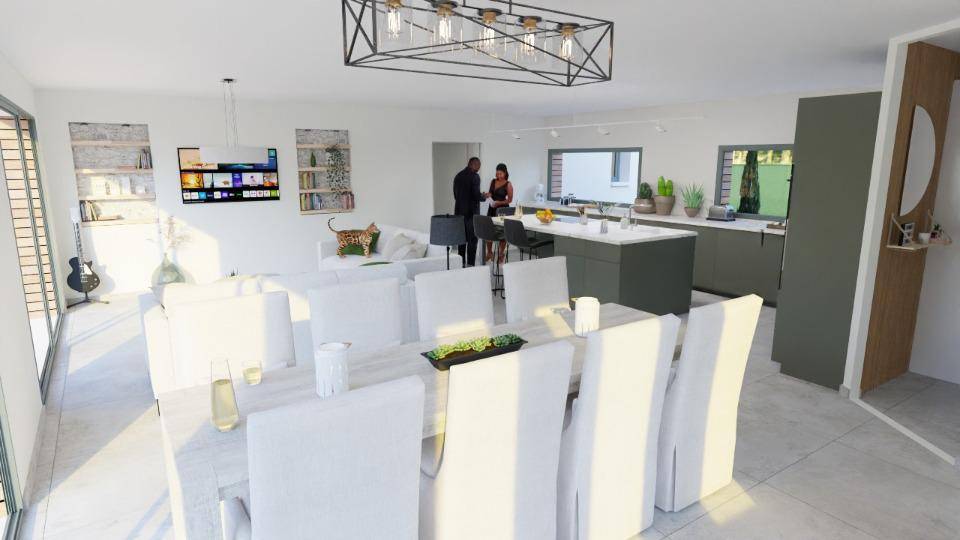 TERRAIN ET MAISONTerra 104 : L’alliance parfaite entre confort, espace et performance en ossature boisDécouvrez Terra 104, une maison de plain-pied de 104 m² au design chaleureux et contemporain, pensée pour offrir à votre famille un cadre de vie à la fois spacieux, lumineux et résolument fonctionnel. Grâce à sa construction en ossature bois, elle combine efficacité énergétique, bien-être intérieur et esthétisme naturel.Un vaste espace de vie lumineux de 45,54 m²Au coeur de Terra 104 se trouve un espace jour généreux de 45,54 m², baigné de lumière grâce à ses larges ouvertures. Cet espace convivial devient rapidement le centre des moments partagés : repas animés, soirées en famille, moments de détente… tout y trouve naturellement sa place.Ouvert, accueillant et parfaitement structuré, il crée une atmosphère chaleureuse où il fait bon vivre chaque jour.Quatre chambres pour le confort de toute la famillePensées comme de véritables cocons, les quatre chambres offrent à chaque membre de la famille son espace d’intimité. Qu’il s’agisse d’une chambre parentale, d’espaces pour les enfants ou d’une pièce polyvalente, chacun y profite d’un environnement calme et ressourçant.Des espaces fonctionnels qui simplifient le quotidienTerra 104 mise sur la praticité pour vous offrir une vie plus facile et mieux organisée :un cellier idéal pour le rangement et la gestion du quotidien,un garage intégré pour stationner en toute sécurité,une salle de bains fonctionnelle, adaptée à toute la famille,un dégagement central pour une circulation fluide dans toute la maison,des toilettes séparées pour un confort optimal.Chaque détail a été soigneusement pensé pour créer un intérieur à la fois accueillant, moderne et fonctionnel.