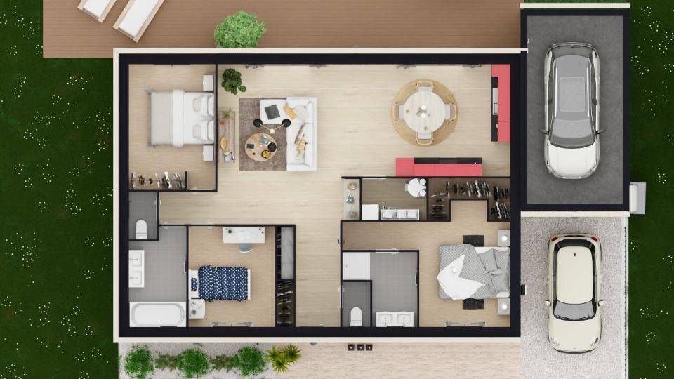 TERRAIN ET MAISONLaissez-vous séduire par cette maison contemporaine à haute performance énergétique (DPE A), pensée pour le confort de toute la famille.Au rez-de-chaussée, un hall d’entrée dessert une vaste pièce de vie lumineuse, intégrant un salon-séjour et une cuisine ouverte moderne. Un cellier attenant vient compléter cet espace, idéal pour une organisation optimale.La suite parentale au rez-de-chaussée offre un véritable cocon avec chambre, dressing et salle de bain privative.À l’étage, trois chambres, chacune avec leur salle de bain dédiée, garantissent intimité et confort. Un dressing sur le palier vient optimiser le rangement de l’espace nuit.Le chauffage gainable assure un confort thermique homogène dans toute la maison, et un double garage vient compléter l’ensemble.Contactez-nous pour découvrir ce bien d’exception.Contactez-nous au (Numéro supprimé).Frais de notaire non compris.Cette annonce a été créée et diffusée avec le logiciel VITAHOME.