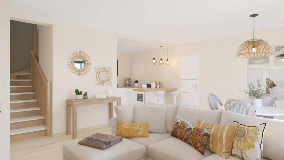 TERRAIN ET MAISONLaissez-vous séduire par cette maison contemporaine à haute performance énergétique (DPE A), pensée pour le confort de toute la famille.Au rez-de-chaussée, un hall d’entrée dessert une vaste pièce de vie lumineuse, intégrant un salon-séjour et une cuisine ouverte moderne. Un cellier attenant vient compléter cet espace, idéal pour une organisation optimale.La suite parentale au rez-de-chaussée offre un véritable cocon avec chambre, dressing et salle de bain privative.À l’étage, trois chambres, chacune avec leur salle de bain dédiée, garantissent intimité et confort. Un dressing sur le palier vient optimiser le rangement de l’espace nuit.Le chauffage gainable assure un confort thermique homogène dans toute la maison, et un double garage vient compléter l’ensemble.Contactez-nous pour découvrir ce bien d’exception.Contactez-nous au (Numéro supprimé).Frais de notaire non compris.Cette annonce a été créée et diffusée avec le logiciel VITAHOME.