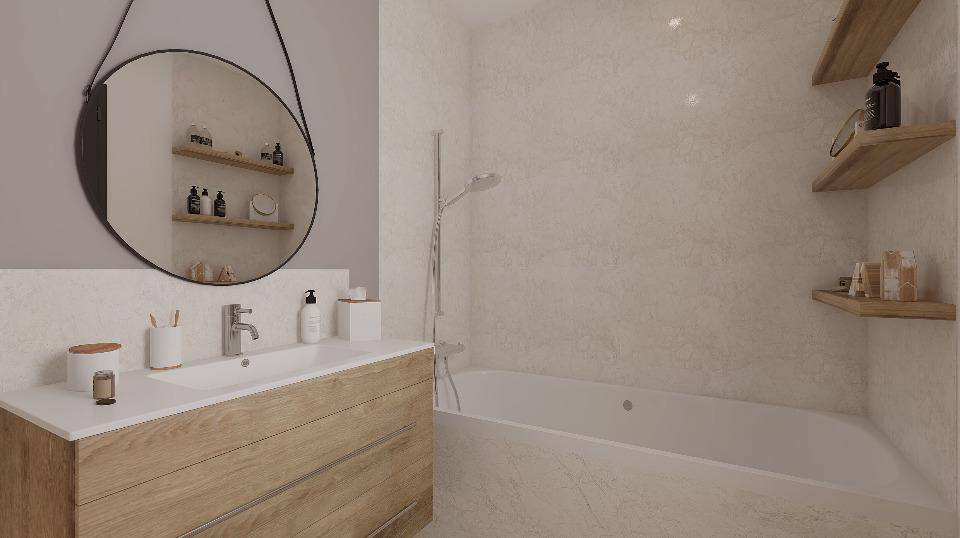 Votre maison bioclimatique est livrée crépis gratté + carrelage dans toutes les pièces (A choisir). Dans la salle de bain la faïence est comprise (A choisir). Les sanitaires avec meuble vasque et wc suspendu sont déjà inclus. Tous les volets sont motorisés