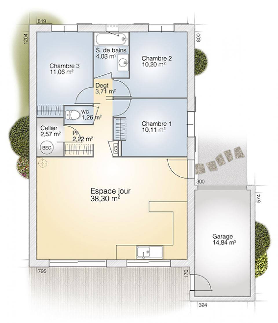 Conçue de plain-pied, elle est composée de trois chambres, d'une cuisine et d'une salle de bains. La maison est neuve.