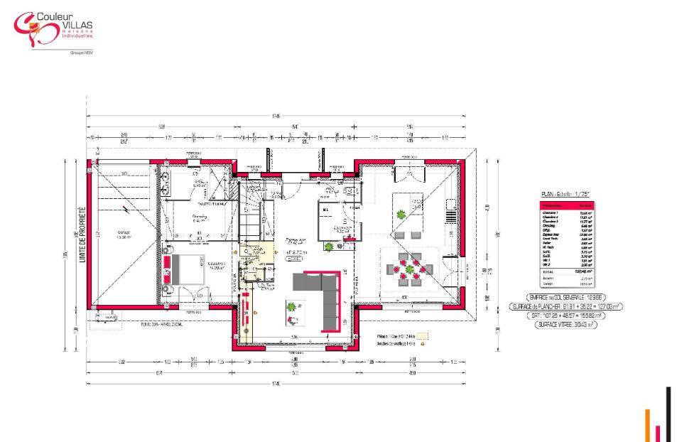 Ce modèle de 120 m² habitables avec étage partiel comprend trois chambres, dont une suite parentale au rez-de-chaussée, une belle pièce de vie lumineuse, ainsi qu'un garage attenant, implanté en limite de propriété pour optimiser l'espace.