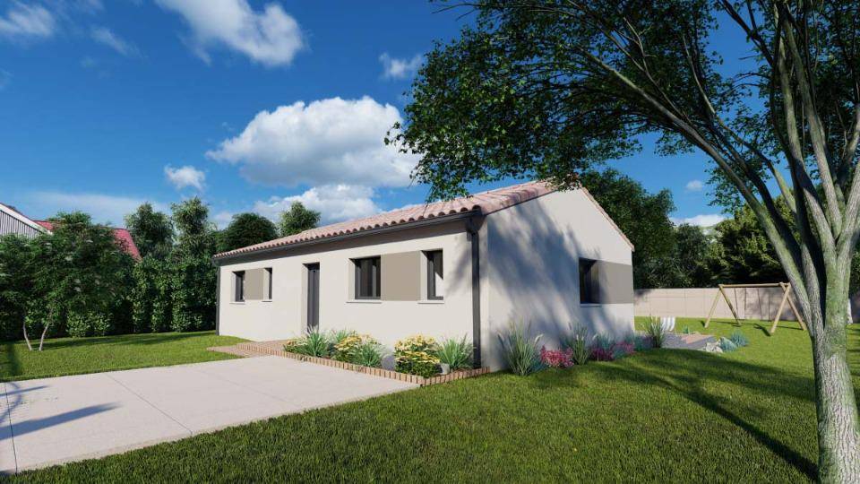 Conçue de plain-pied, elle comporte trois chambres, une cuisine et une salle de bains. Cette maison est neuve.