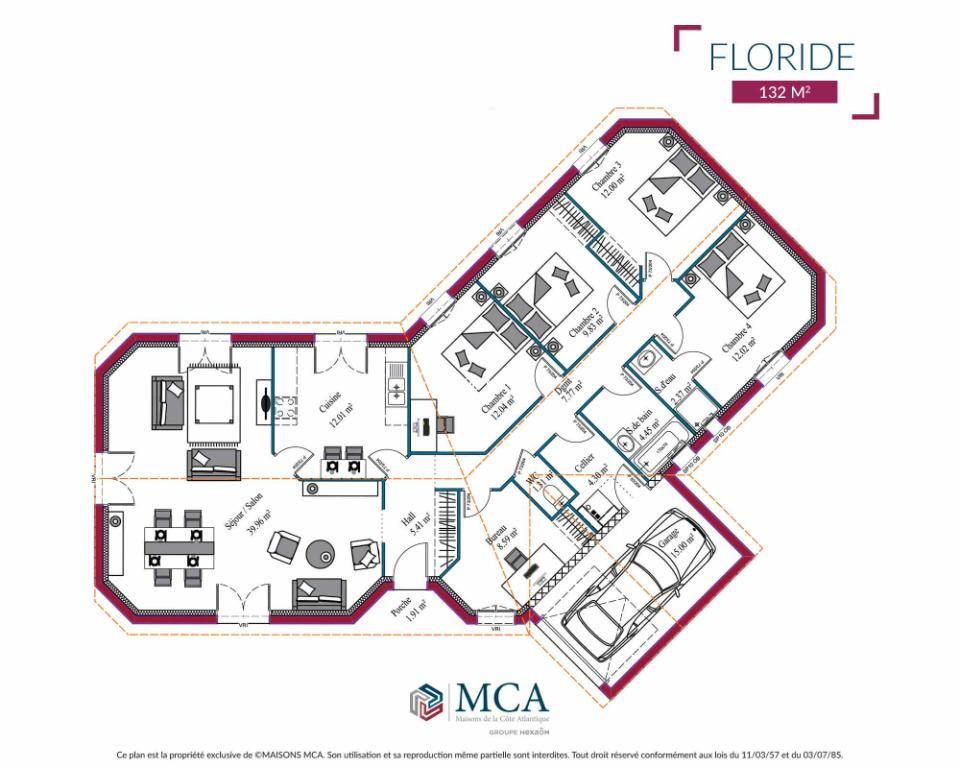 Ici, nous vous proposons d'implanter le modèle Floride de 113m² vous offrant de belles pièces à vivre