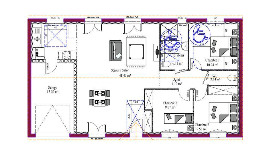 Conçue de plain-pied, elle dispose de trois chambres, d'une cuisine et d'une salle de bains. La maison est neuve.