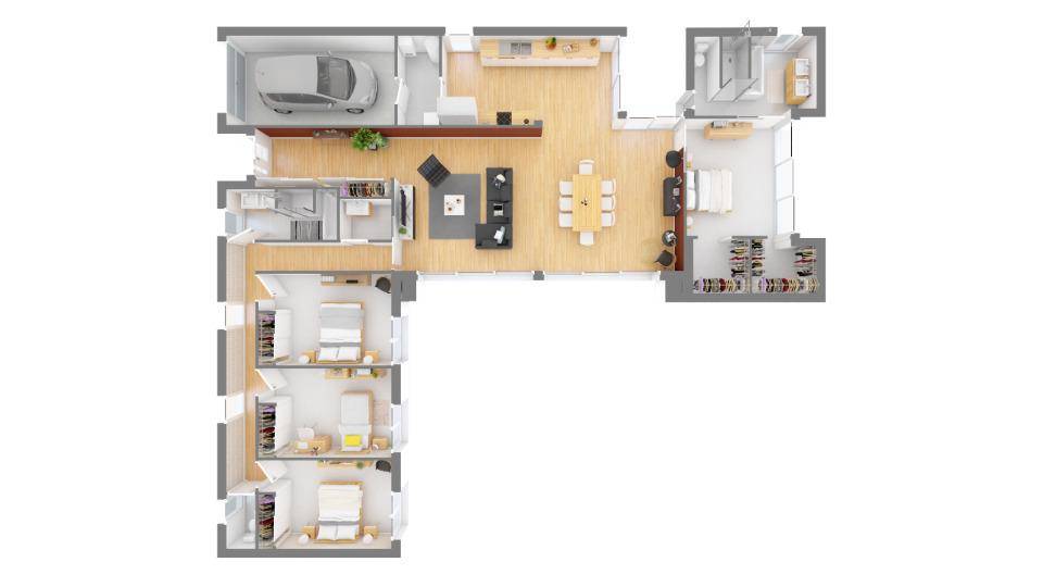 TERRAIN ET MAISONLa millenium 4 chambres est le plain-pied idéal pour toute la famille. La villa se compose d’un vaste et lumineux Salon/Séjour doté d’une grande baie vitrée attenant à un garage. Le coté nuit s’articule autour de 4 chambres avec placard, un WC indépendant et une grande salle de bains. Cette maison, d’architecture sobre et élégante, est à construire dans le département du Tarn, l’Aude, l’Hérault, la Haute-Garonne ainsi que les Pyrénées Orientales par Oc résidences, votre constructeur sur mesure en Occitanie.